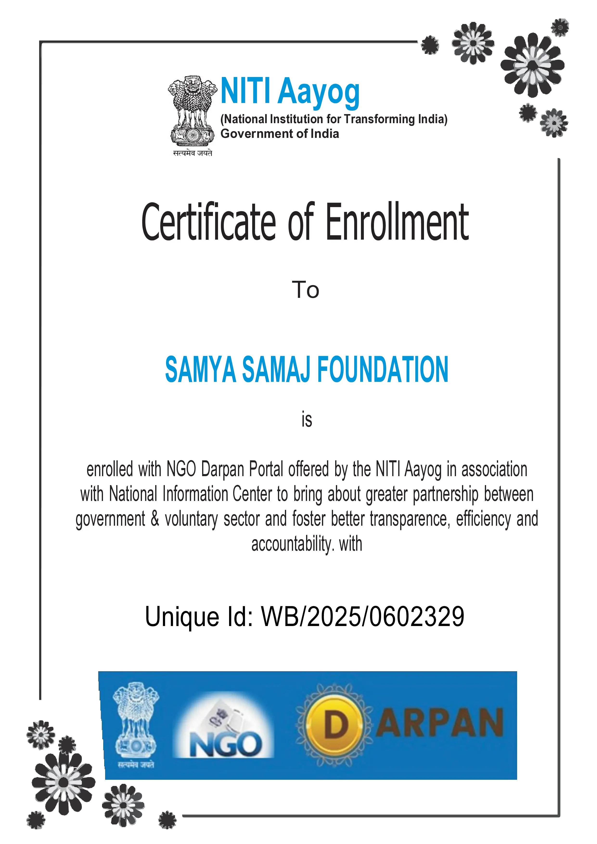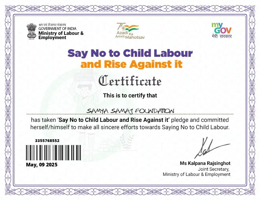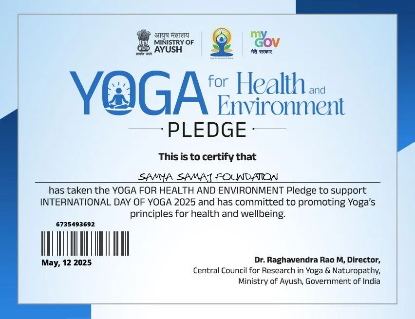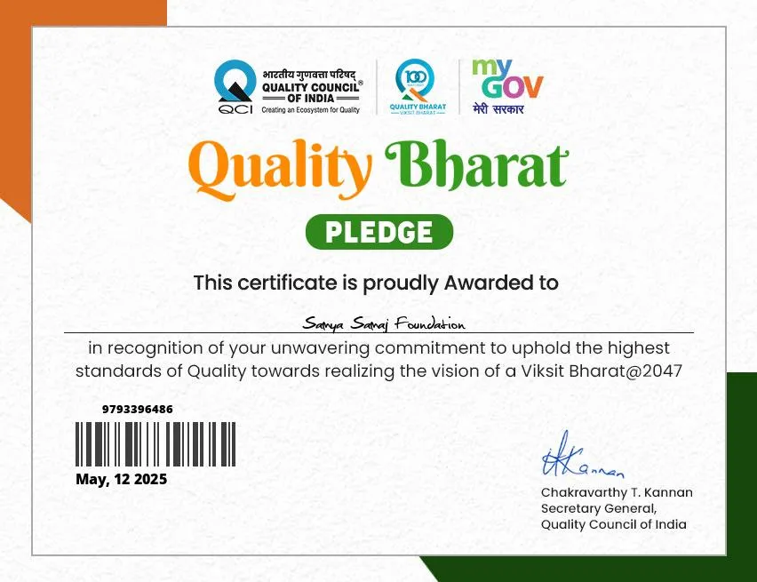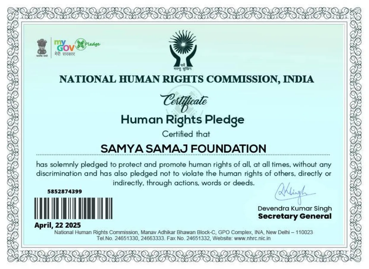 Samya Samaj Foundation is a nationally recognized, ISO 9001:2015 certified and MSME-authorized Non-Profit Public Charitable Trust, operating under the Indian Trust Act 1882 (Deed No.: IV-190200467/2025). We are officially registered with the Government of India through NITI Aayog (ID No: WB/2025/0602329), ensuring full transparency, governance, and accountability in all our charitable operations.